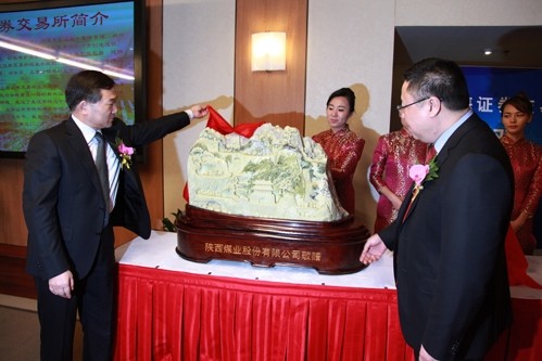 上市儀式上,陜西煤業(yè)化工集團(tuán)公司總經(jīng)理楊照乾與上海證劵交易所領(lǐng)導(dǎo)互換了上市紀(jì)念品,隨后,陜西煤業(yè)股份公司總經(jīng)理宋老虎代表公司簽訂了《上市協(xié)議書》。